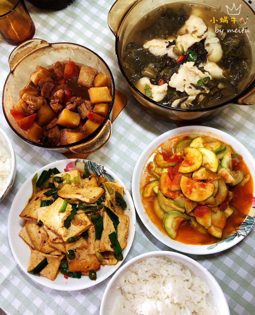 今日午餐🥣:酸菜鱼、土豆胡萝卜红烧肉、番茄西葫芦和蒜苗烧豆腐。