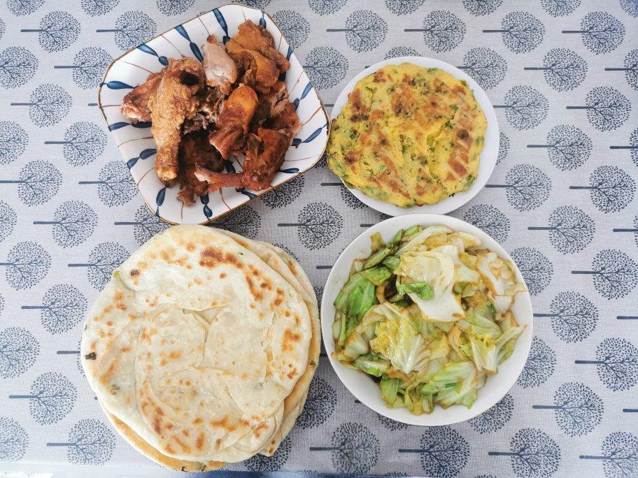 烙玉米榆钱杂粮饼、葱油饼、干煸大头菜于买的炸鸡腿!