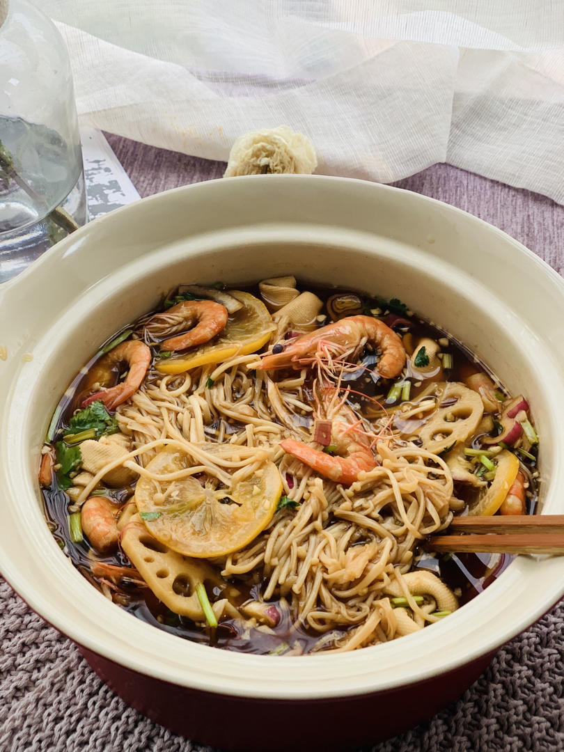 同样的汤料泡了一锅素菜和鸡尾虾,太好吃😋