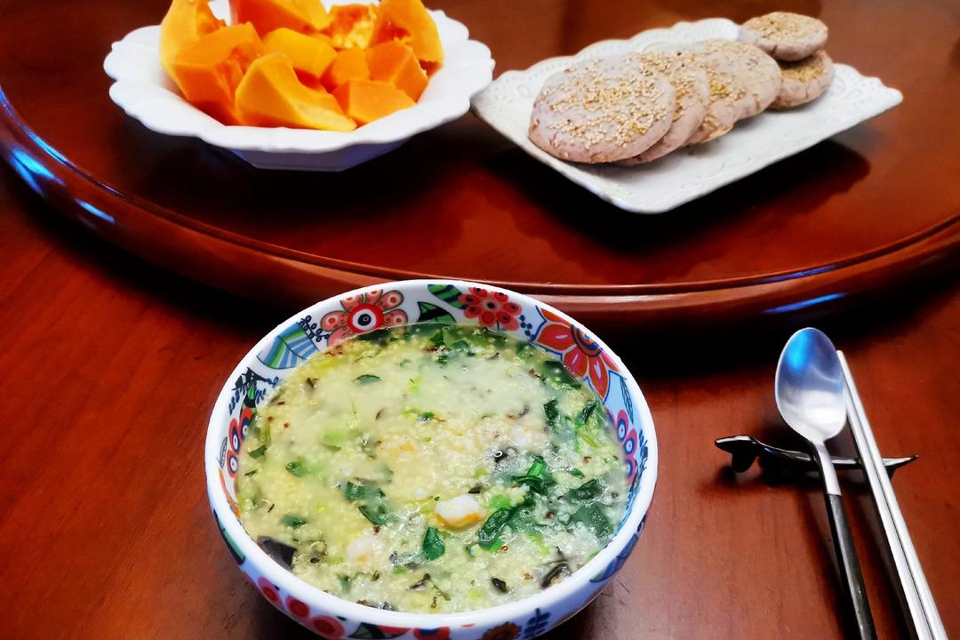 低卡早餐:小米虾仁青菜粥+芋泥饼
