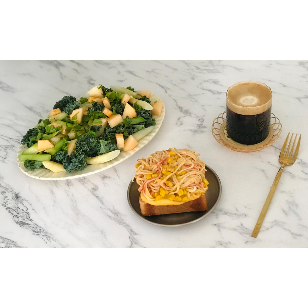 蟹柳滑蛋芝士开放吐司|羽衣甘蓝芦笋蜜瓜沙拉