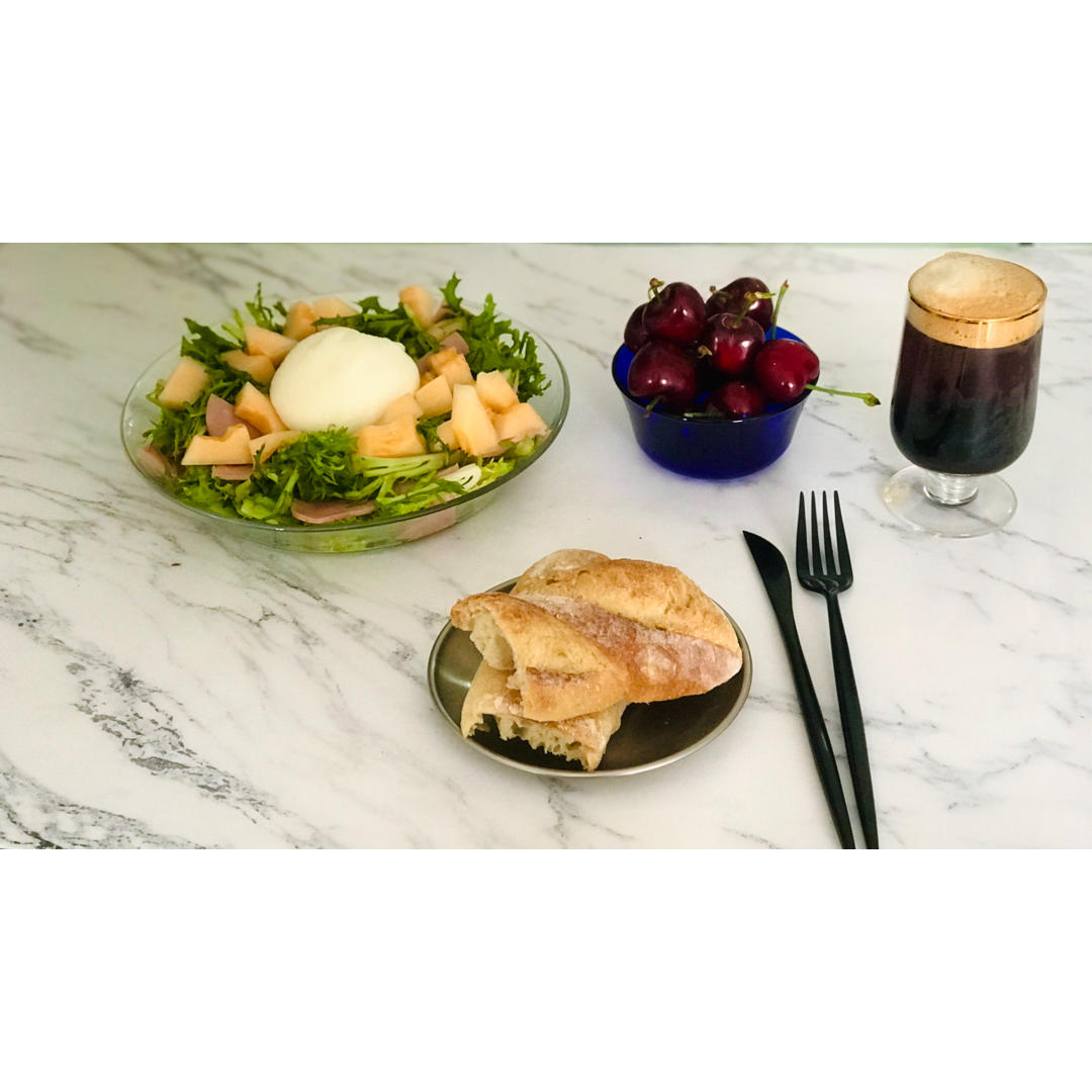 布拉塔蜜瓜火腿沙拉,配烤的嘎嘣脆的法棍,斥巨资买的樱桃,翻出个好久没用的玻璃杯子~