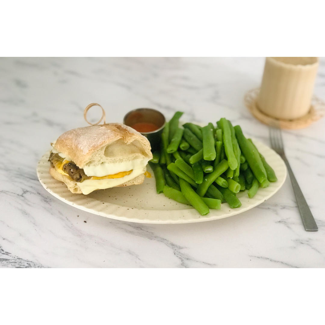 蘑菇滑蛋芝士恰巴塔三明治和燕麦奶拿铁,一直在ole回购一款白奶酪片inalpi超好吃,至于在早上搞了一大盘豆角吃是因为明...