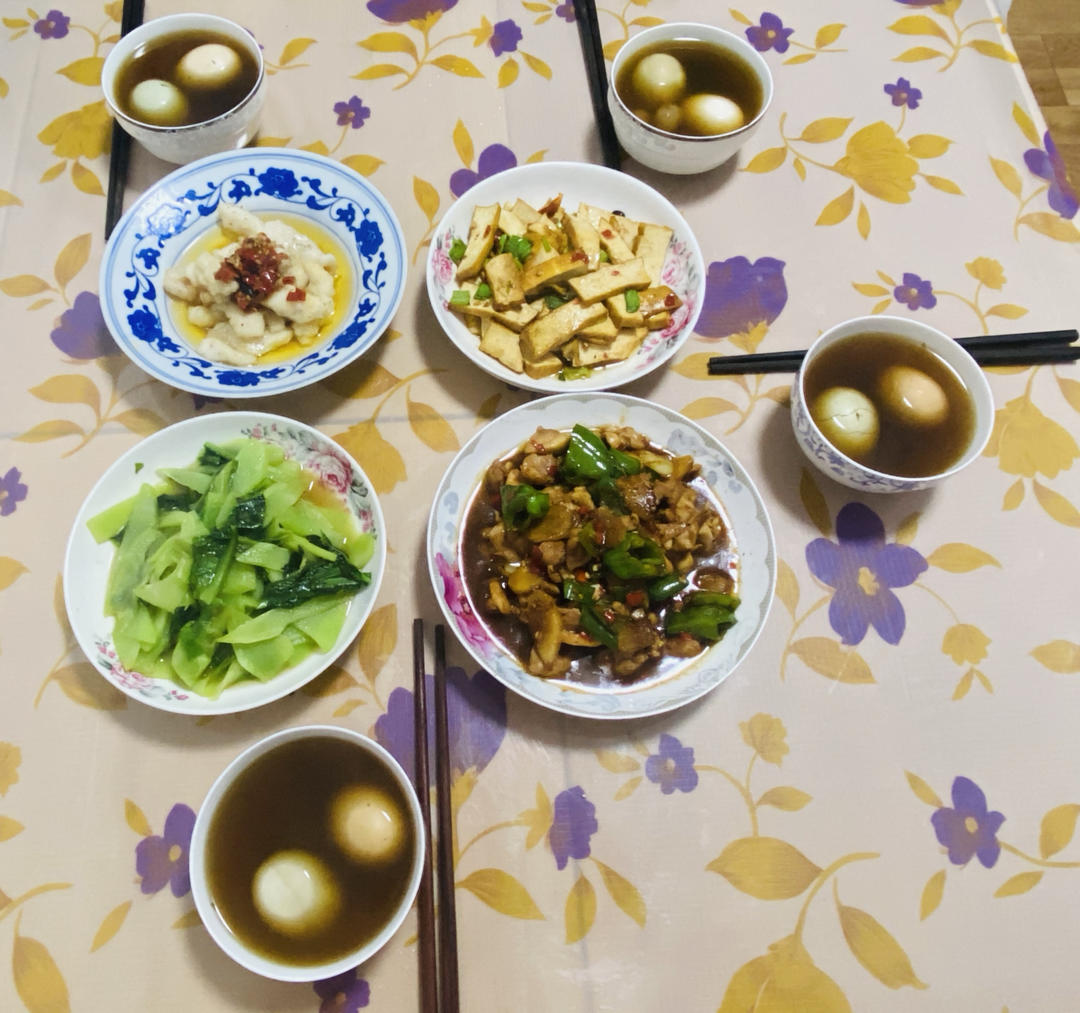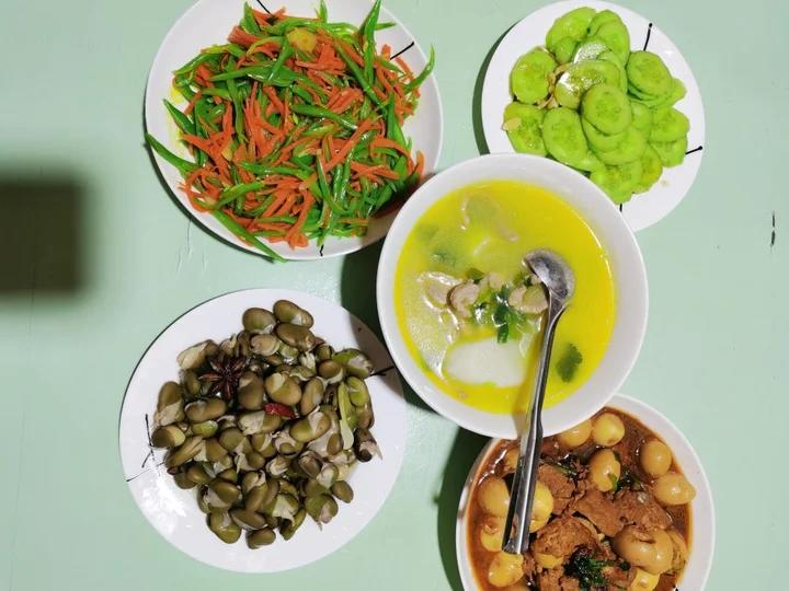 豆角炒胡萝卜、五香蚕豆、素鸡烧鹌鹑蛋、凉拌黄瓜和腱子肉、山药汤