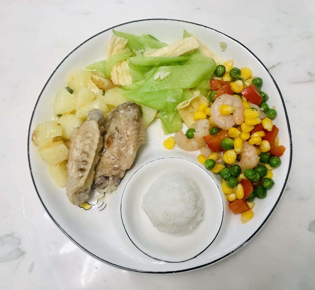 土豆焖鸡翅、腐竹拌青瓜片、虾仁炒时蔬、米饭小香蕉。
