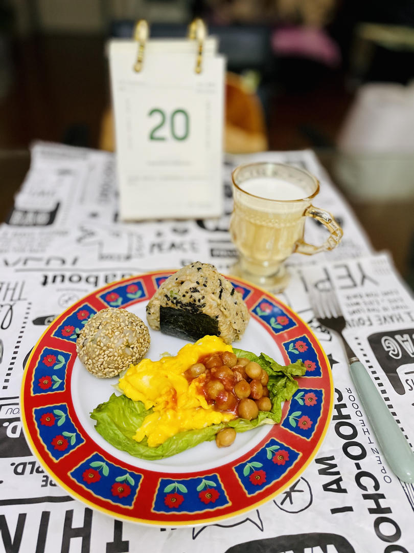 周二,金枪鱼肉松饭团🍙美式炒蛋茄汁焗豆