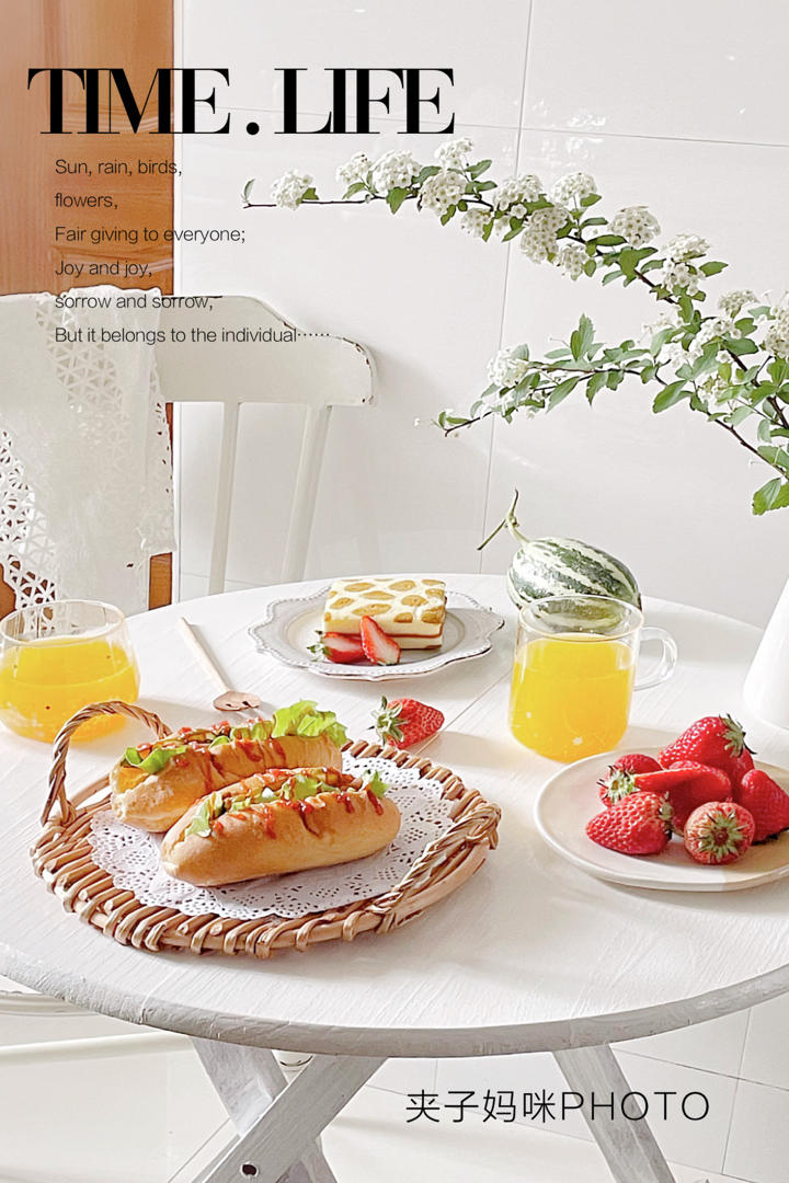 今日份早餐热狗🌭豹纹巧克力蛋糕🍰鲜榨橙汁🍹草莓🍓博洋蜜瓜