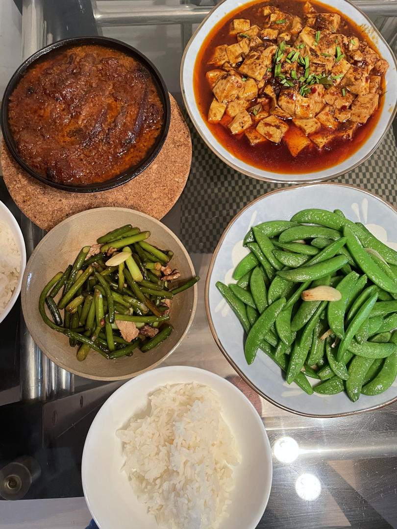 粉蒸肉、麻婆豆腐、炒甜豆、蒜苔炒肉丝、米饭🍚