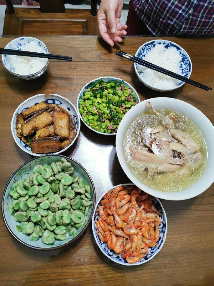 红烧黄辣丁、毛豆、肉丁炒尖椒 、芦笋口蘑炒牛肉、红烧排骨、鱼香茄子🍆炒丝瓜、清炒空心菜。