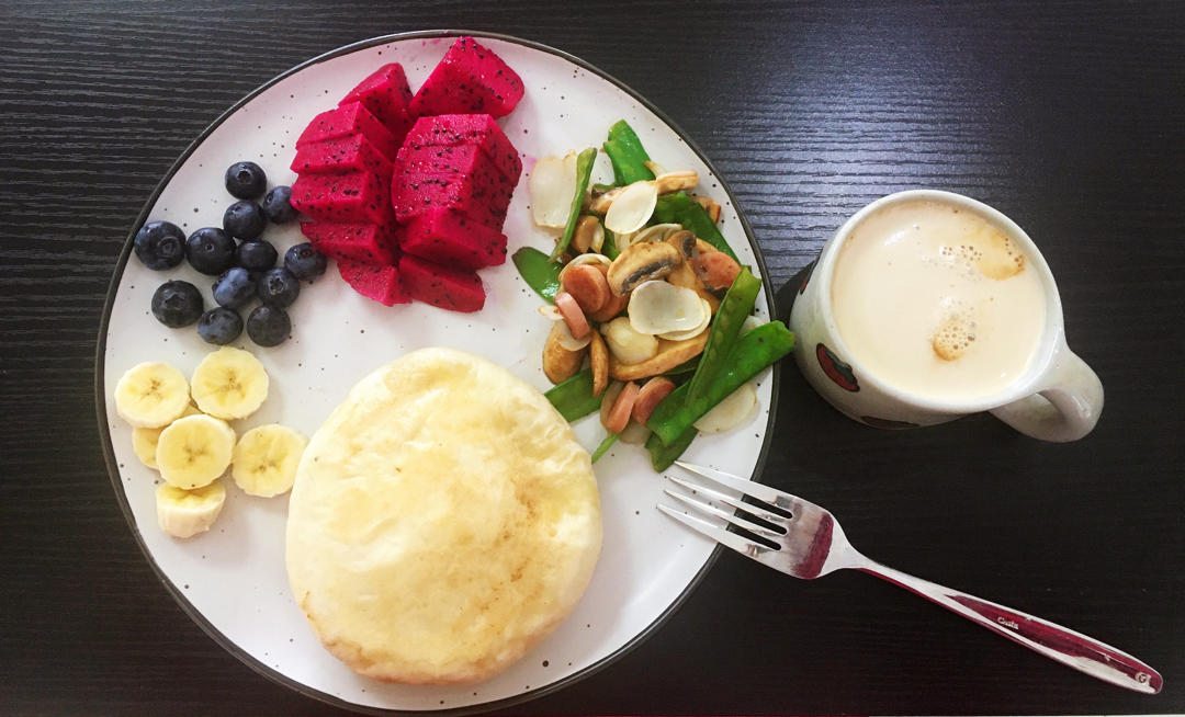 奶酪饼,水果,炒杂蔬,无糖拿铁。
