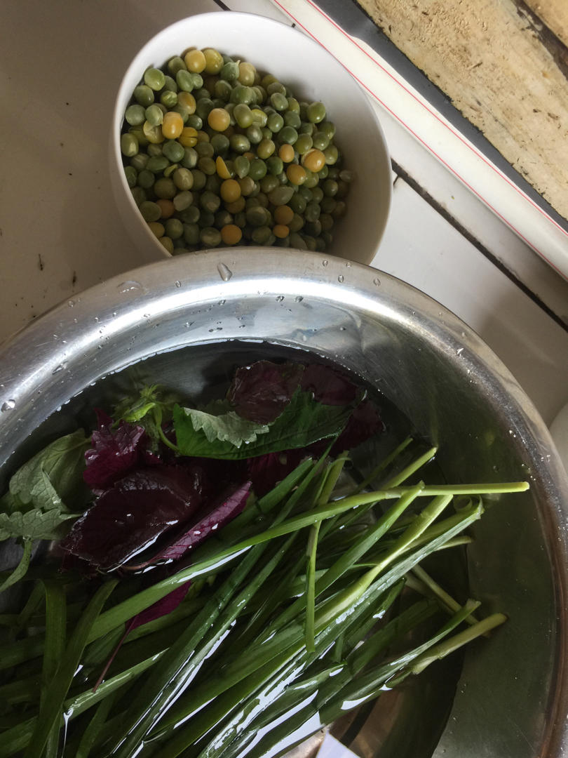 小豌豆煮熟不要水。放油和盐,炒小豌豆加入菲菜炒,加入开水,放紫苏薄荷味精即可。(要本地小豌豆,不要川豆不好吃)