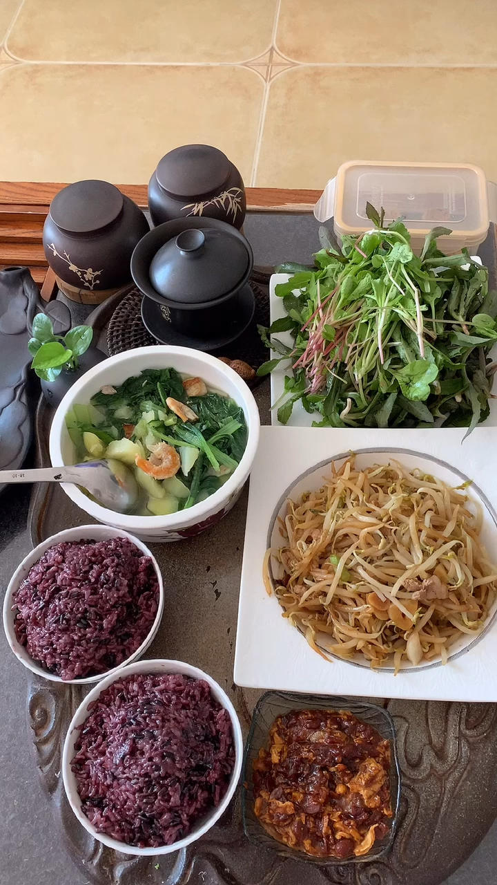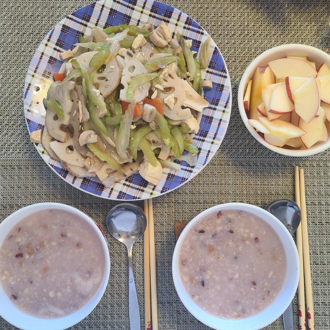 把昨天杨妈妈做的粥热回去,还有带回来的豆腐,加上新鲜的莲藕个芹菜,炒成了一大碟。感谢老杨把苹果🍎切得如此小...