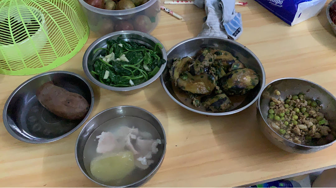 酿茄子,蒜蓉番薯叶,苹果瘦肉汤~主食是番薯,又一顿