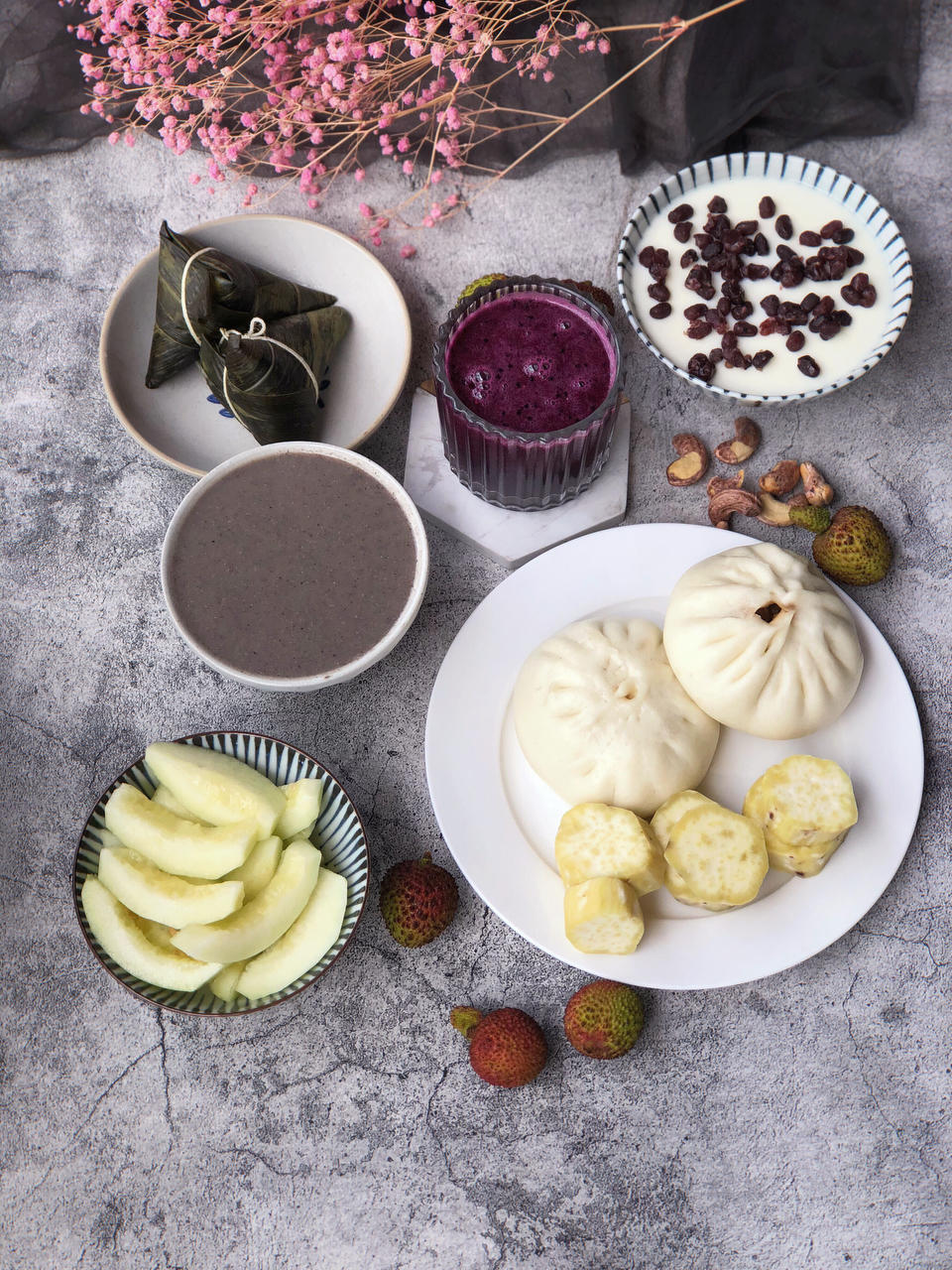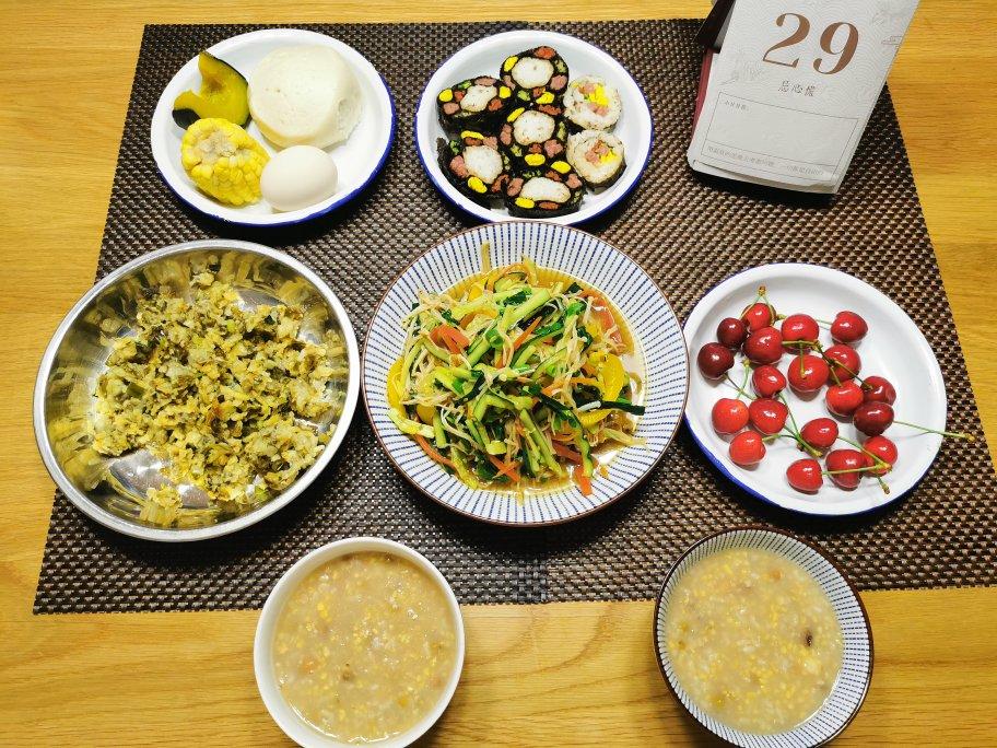 麦饭,时蔬,寿司,鸡蛋,玉米,南瓜,馒头,杂粮粥,樱桃。
