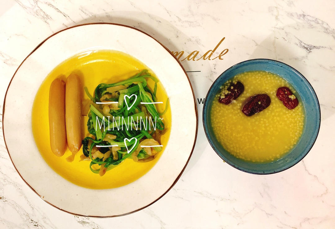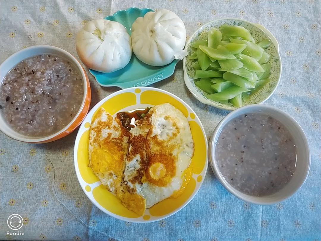 杂粮粥,包子,煎蛋,拌莴笋。