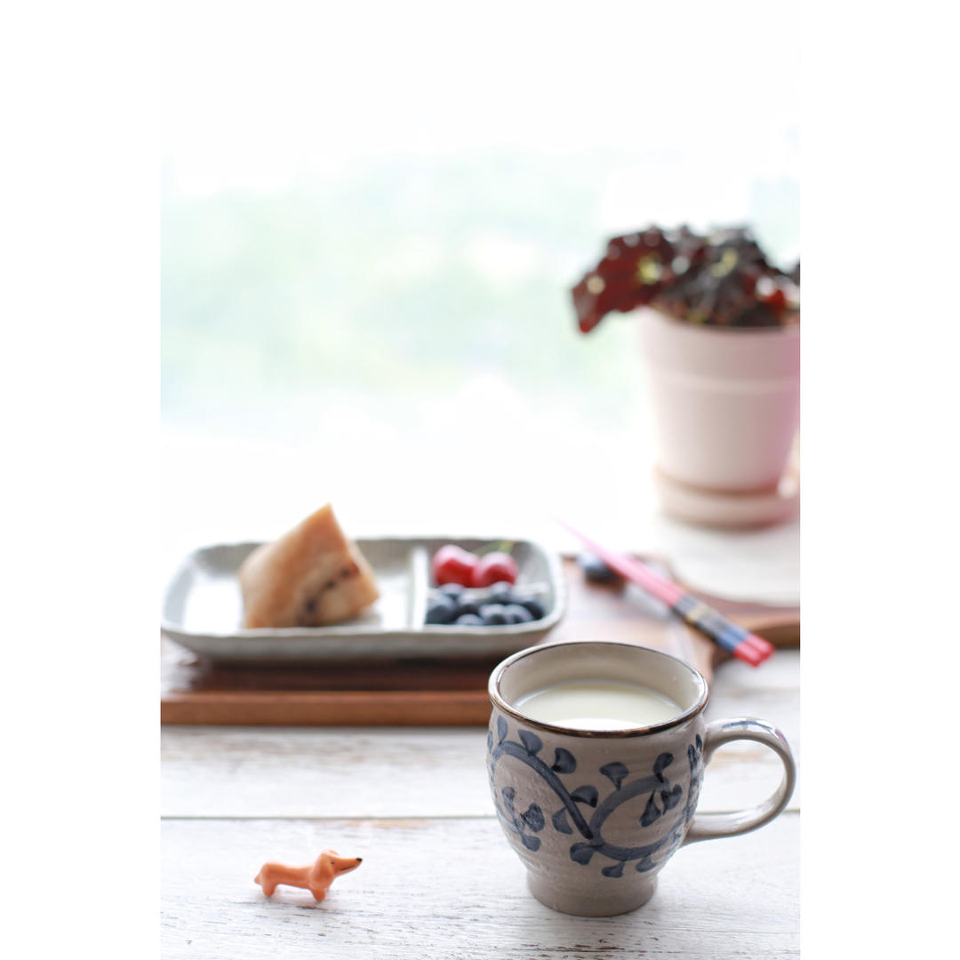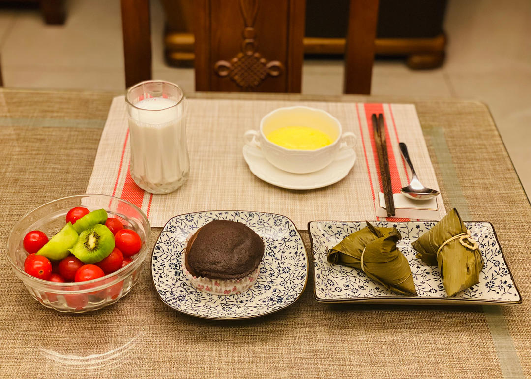 牛奶、麻油蒸蛋、大黄米粽、巧克力墨西哥面包、圣女果奇异果。