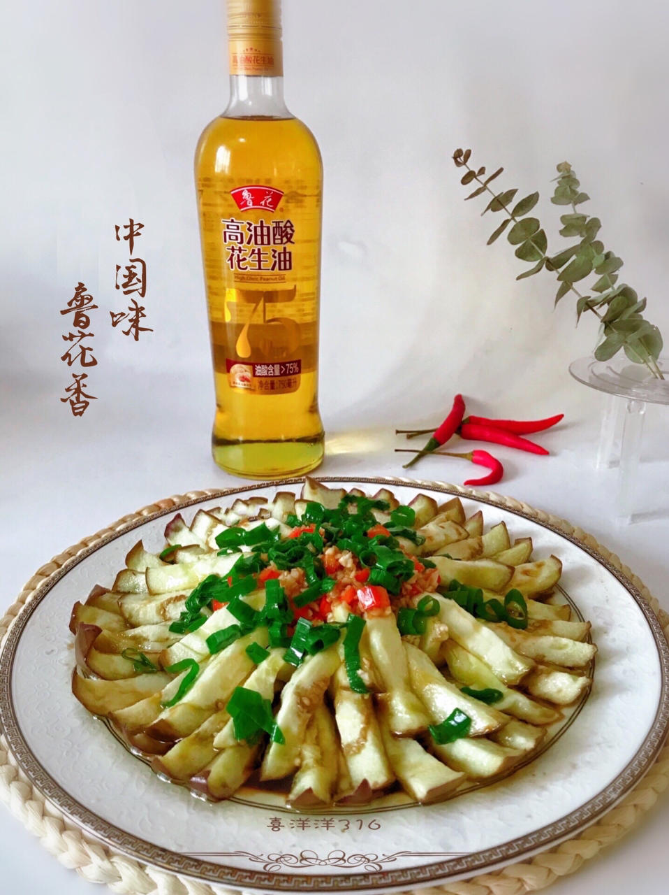 蒸好的茄子放入蒜末、小米辣、葱花然后浇上鲁花滚烫的高油酸花生油,滋啦一声...