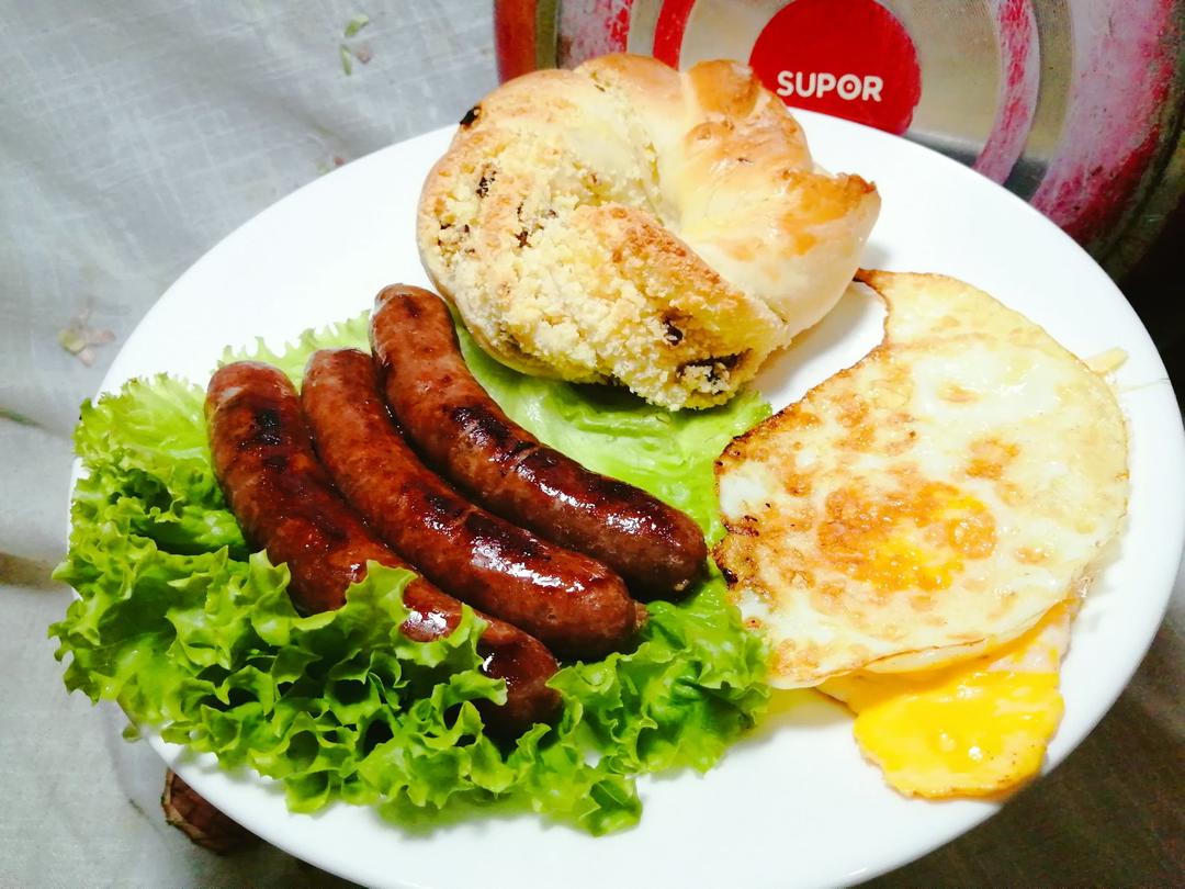 椰蓉花环面包,煎台湾烤肠,煎鸡蛋