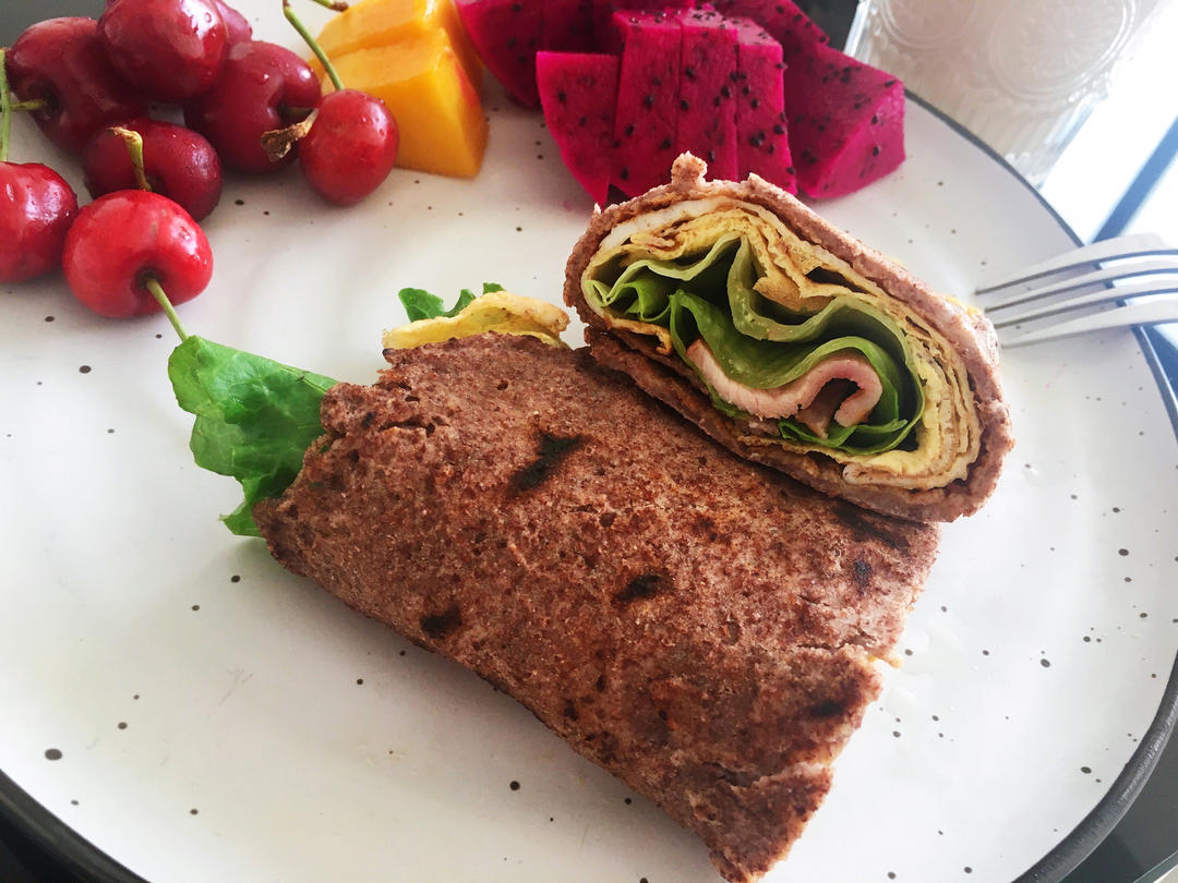 全麦鸡蛋培根卷,水果,无糖拿铁。