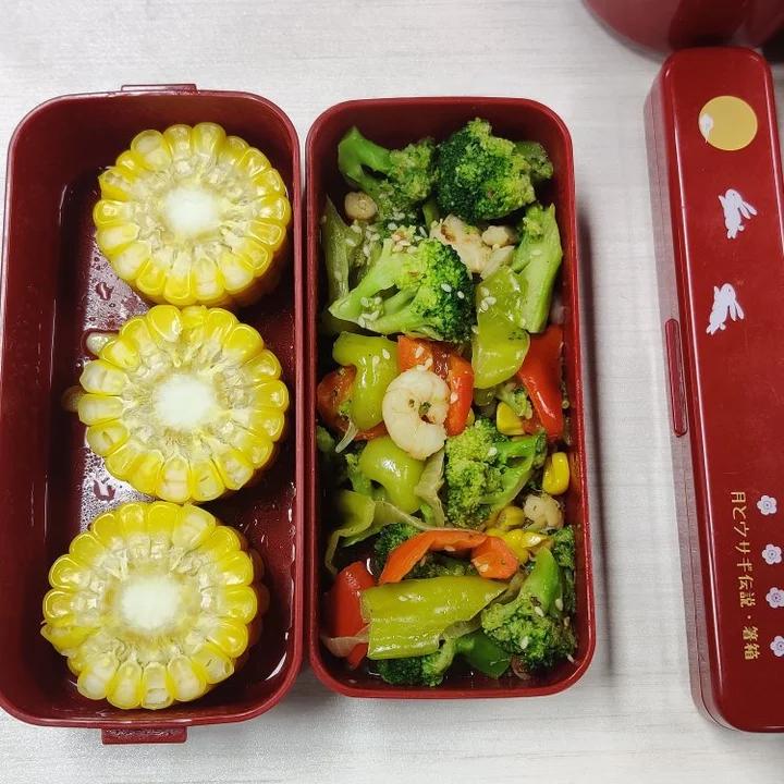 晚上虾仁时蔬+早上煮的玉米