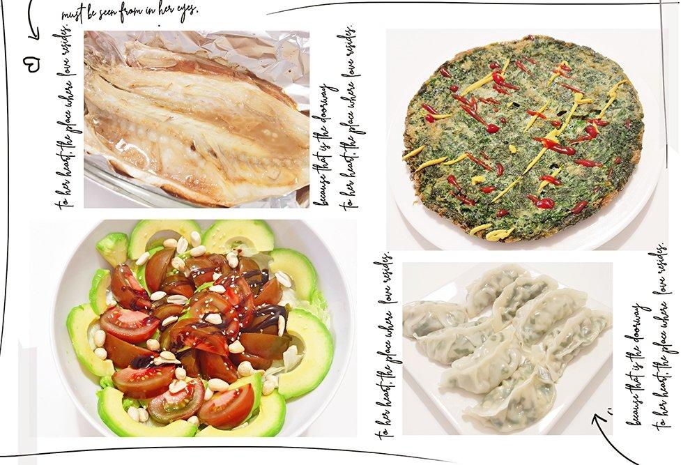 菠菜鸡蛋饼+西红柿🍅 牛油果🥑 沙拉+烤鲈鱼+煎饺(韭菜鸡蛋馅儿)#晚餐•2021年6月30...