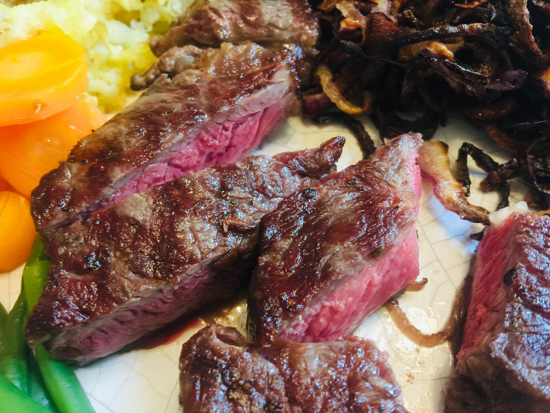 西冷牛扒+焦化洋蔥+土豆泥,素燜扁豆。