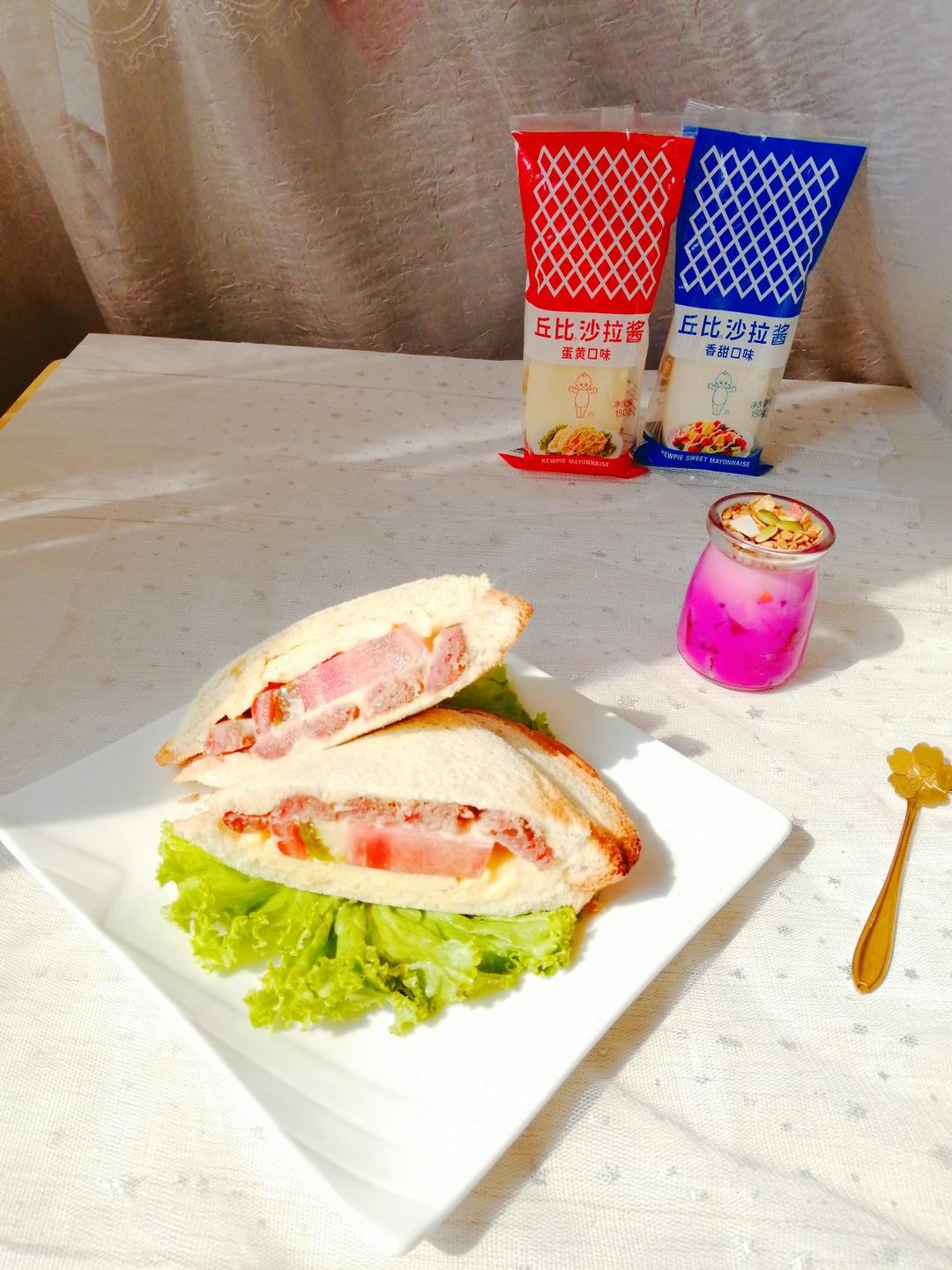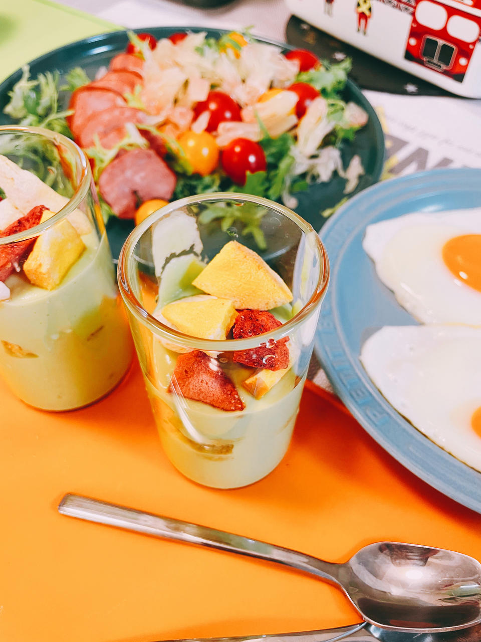 牛油果脆脆杯😄蜜柚小西红柿熏肠沙拉,煎蛋,花生酱吐司