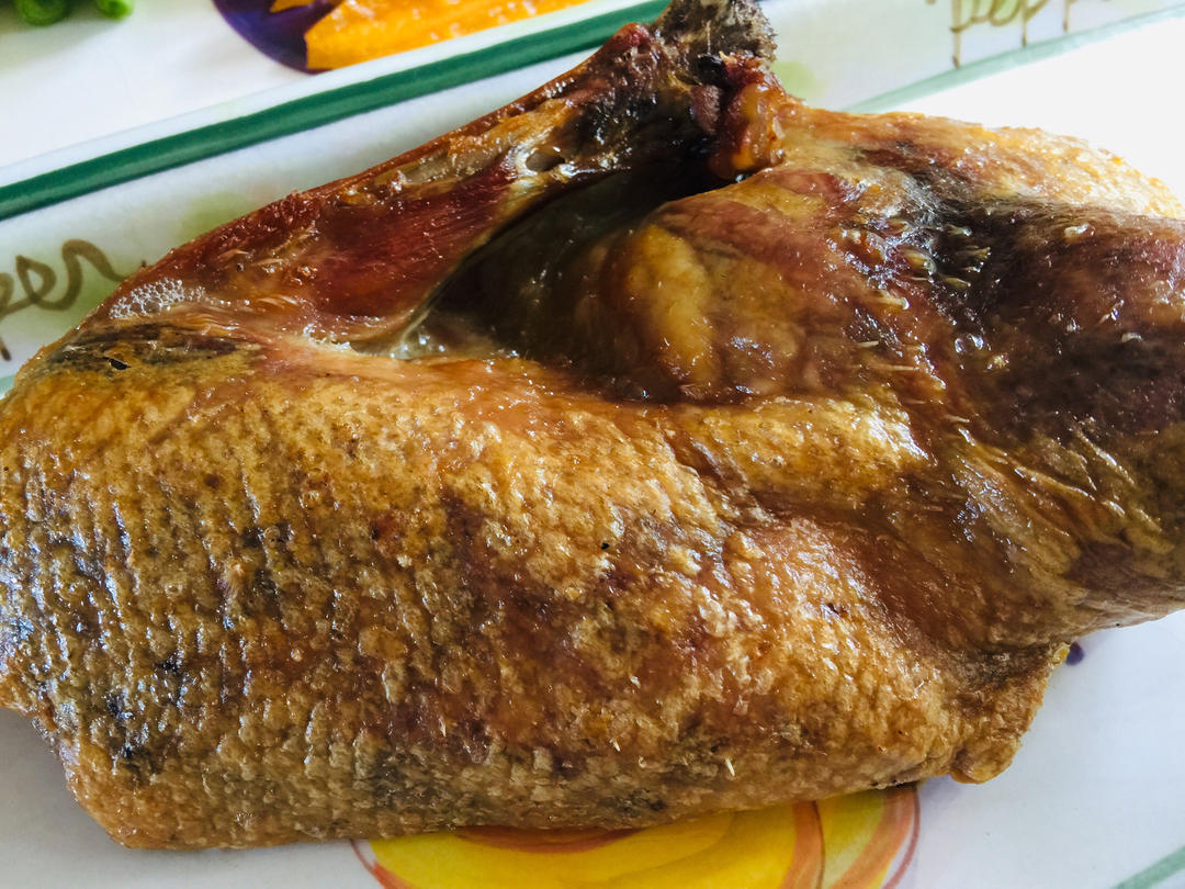 半隻烤鴨。夏天太忙,半成品的烤鴨就成了我的救命稻草。烤箱裡一塞,40分鐘後就吃上了。那碗黑乎乎的其實是生菜,卷烤鴨代替鴨...