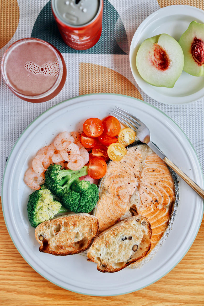 今儿中午吃的这个:硕大一片三文鱼扒+恰巴塔面包两片+西蓝花+虾仁+红黄小番茄+山楂露+鹰嘴桃。