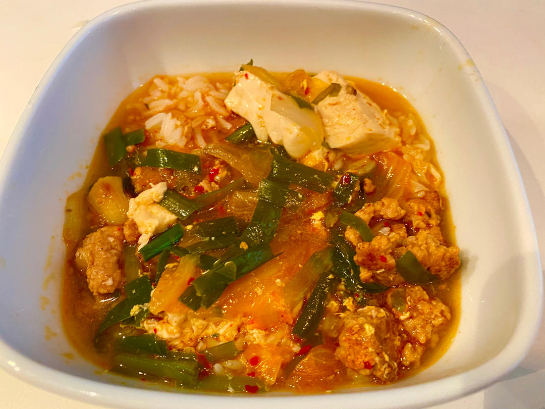 加了韭菜一起炒香,豆腐汤泡饭,完美