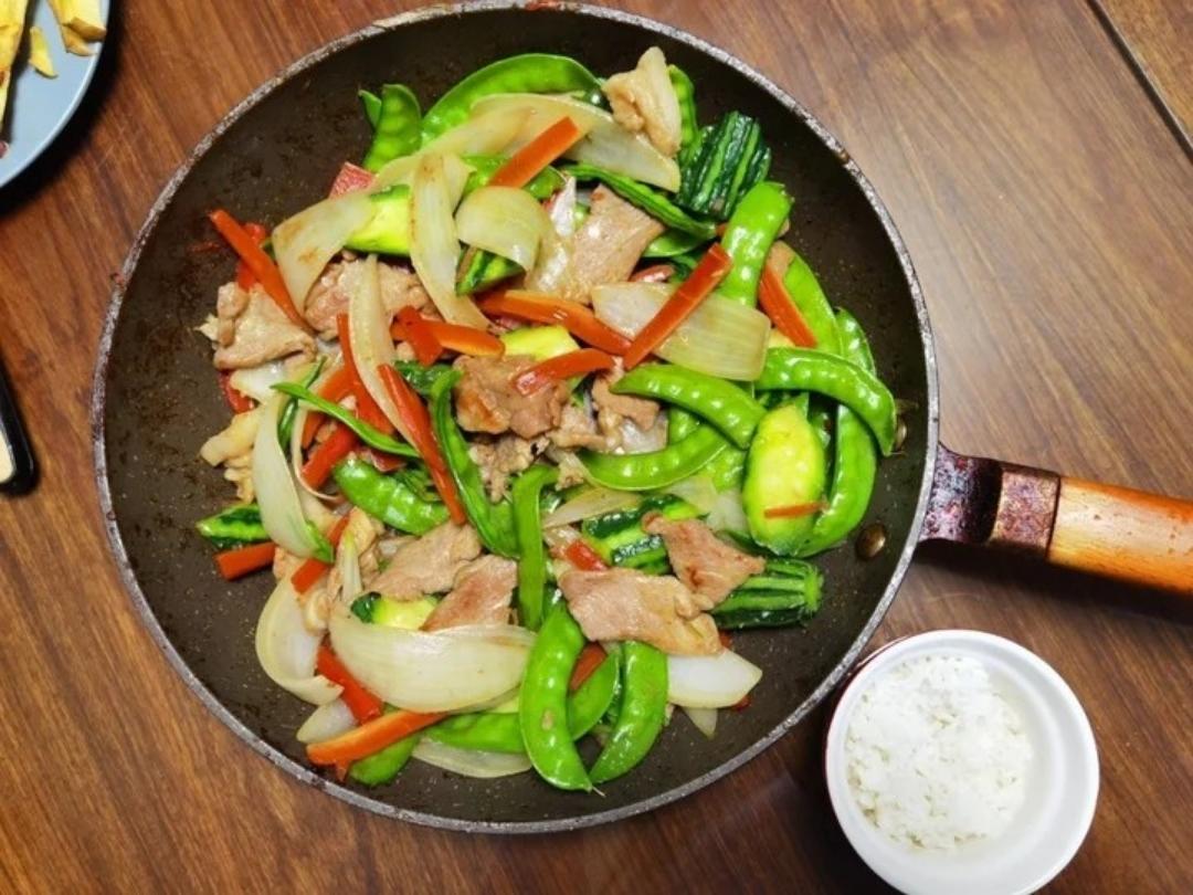 杂菜炒肉片配米饭