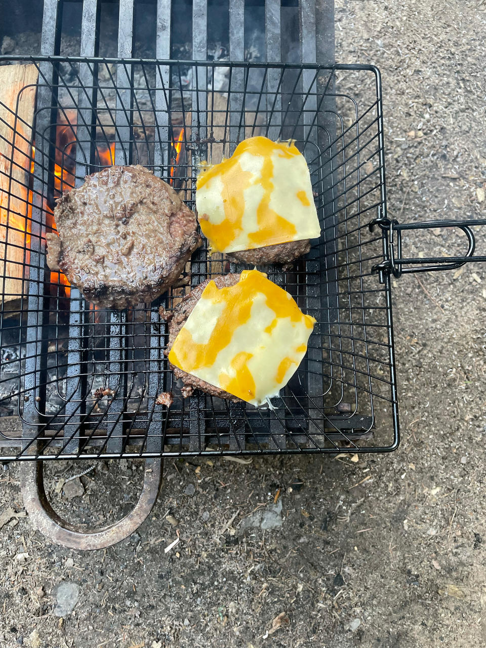 生篝火烤汉堡肉饼,芝士一定要放,然后让它慢慢随温度融化,烤西葫芦撒点盐就好好吃