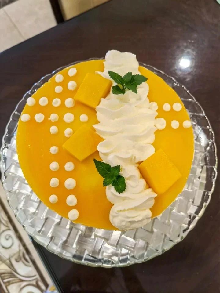 六寸蛋糕胚,280g芒果泥,230g酸奶,500g淡奶油,30g吉利丁片,感觉镜面至少要200g。 外婆的生日蛋糕