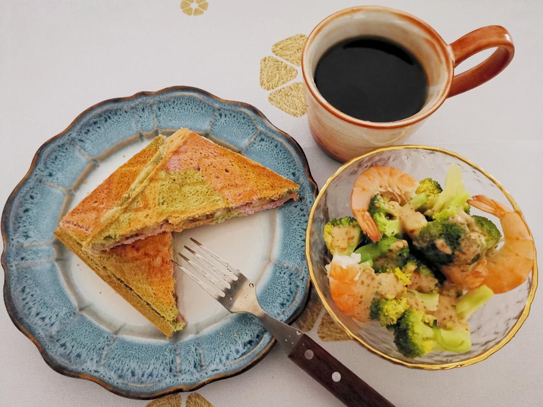 香蕉全麦吐司,西兰花基围虾,黑咖