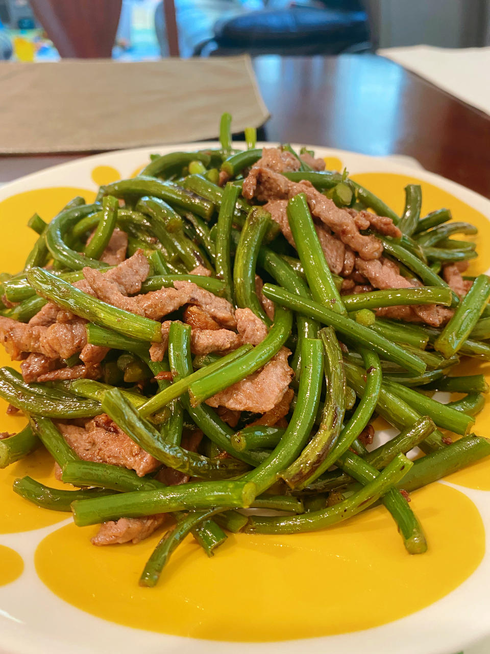 蒜苔没放油,直接用腊肉煸出来的油炒了牛肉丝,然后放了蒜苔煸熟。大概是最后一波蒜苔了