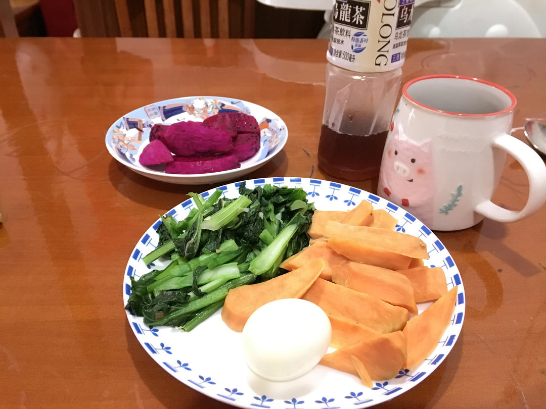 地瓜+鸡蛋+炒青菜 +火龙果+咖啡