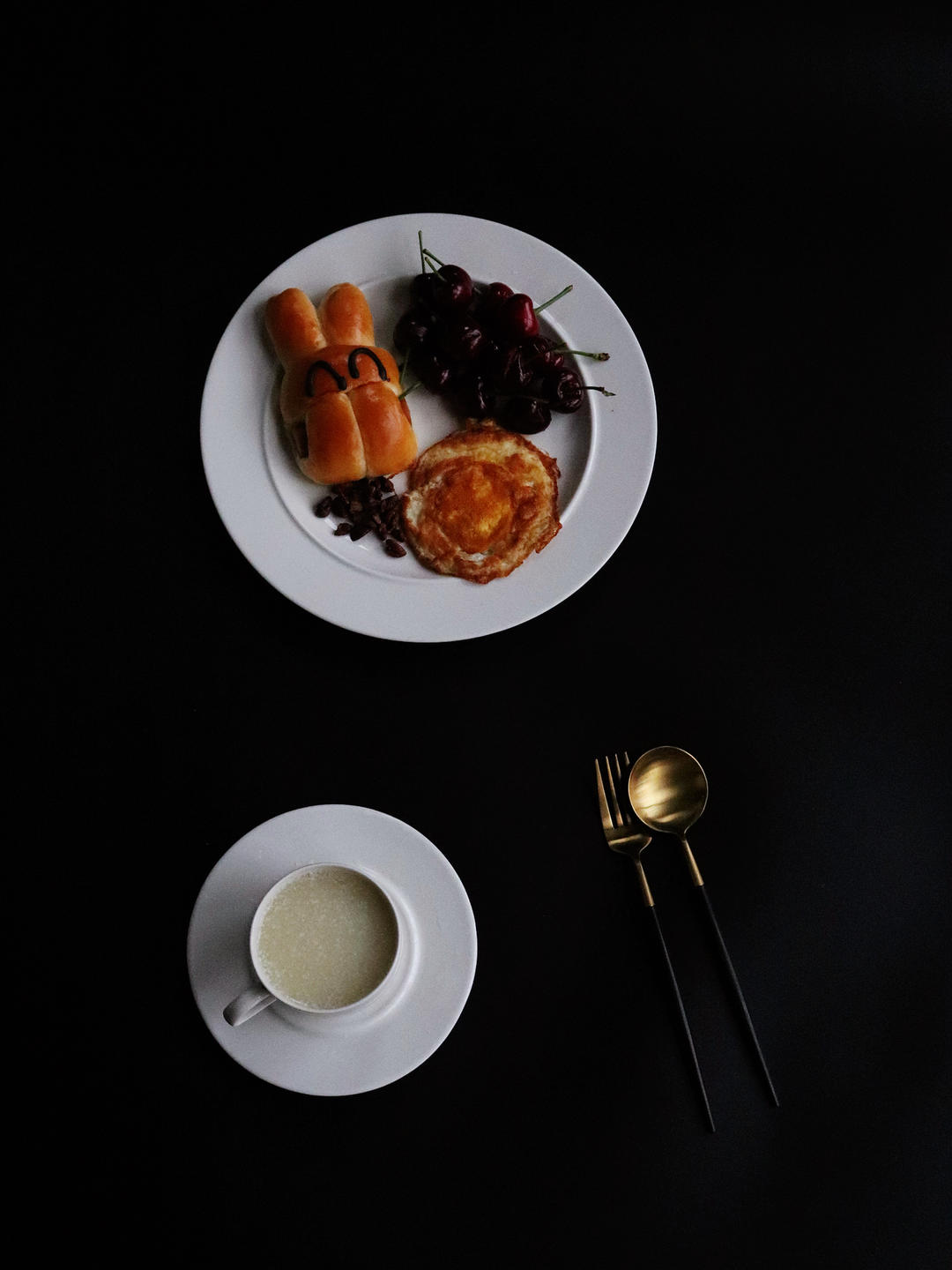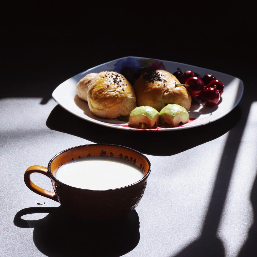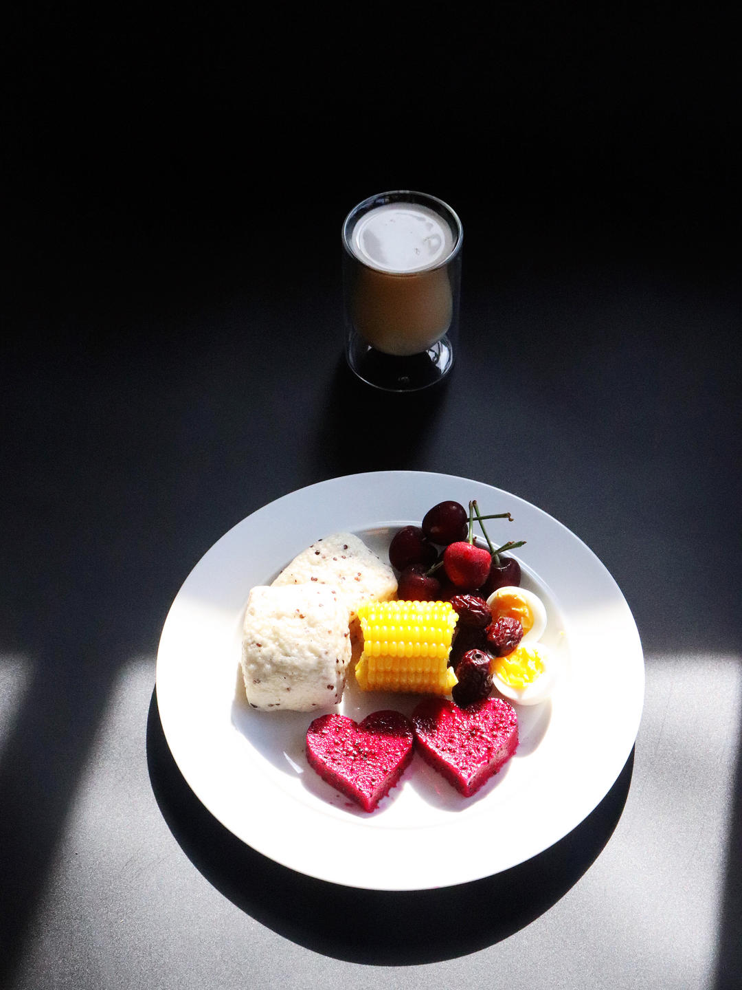 藜麦刀切馒头、玉米、蒸枣、樱桃、火龙果、溏心蛋、拿铁💯