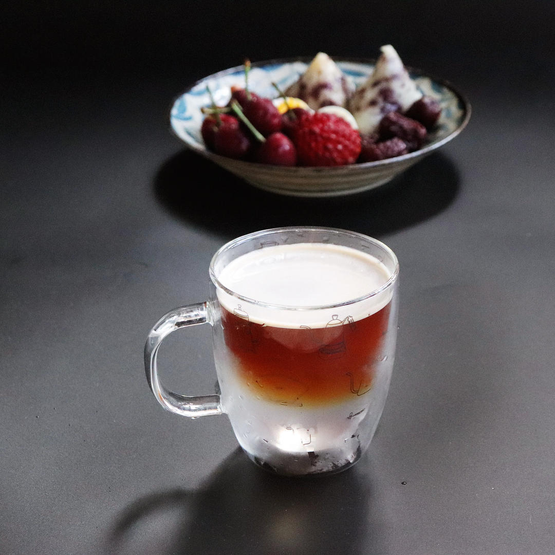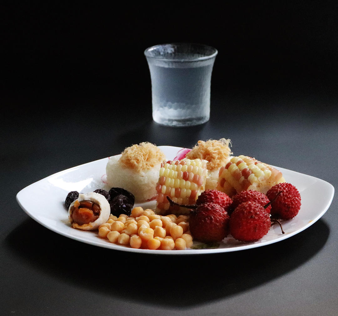 红豆藜麦蜜枣粽、溏心蛋、荔枝、樱桃、蒸枣、腰果,椰汁咖啡💯