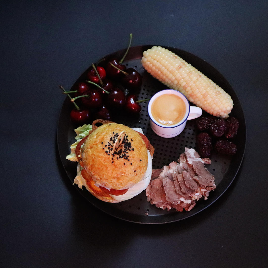 全麦汉堡、玉米、樱桃、蒸枣、牛肉、咖啡