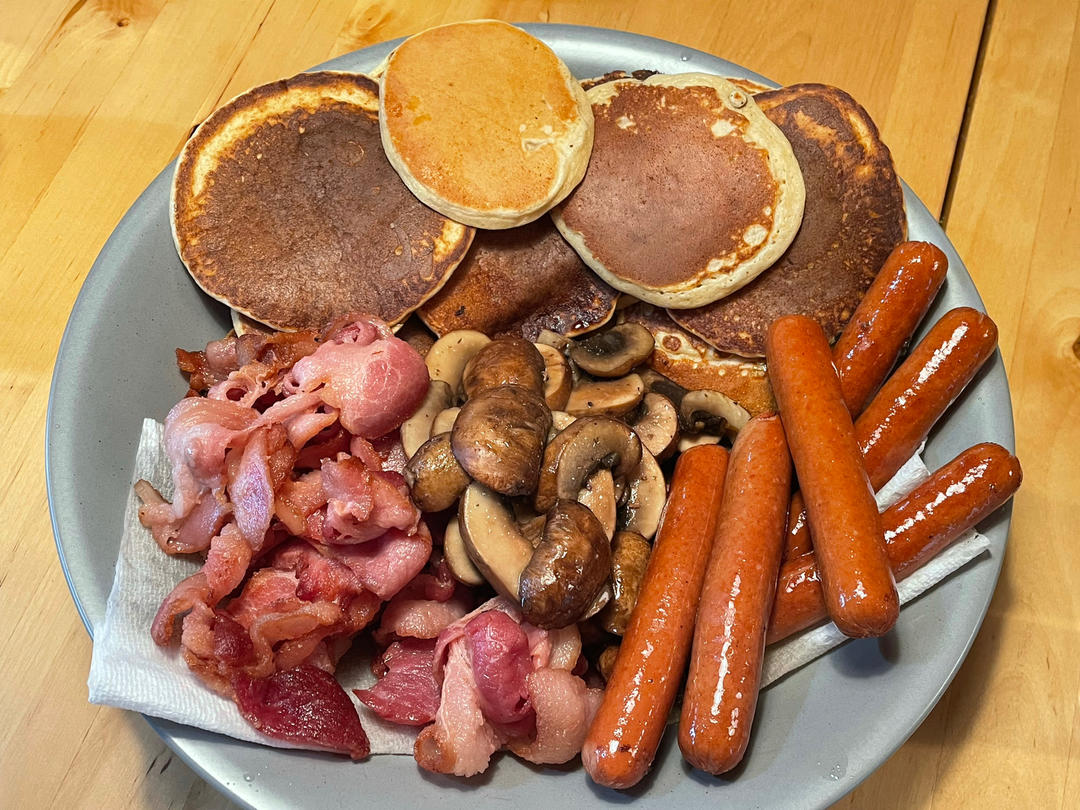 Pancake, hotdog, bacon, mushroom