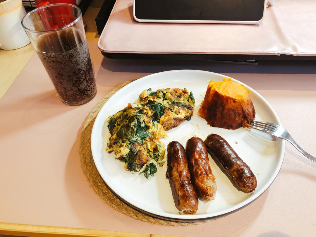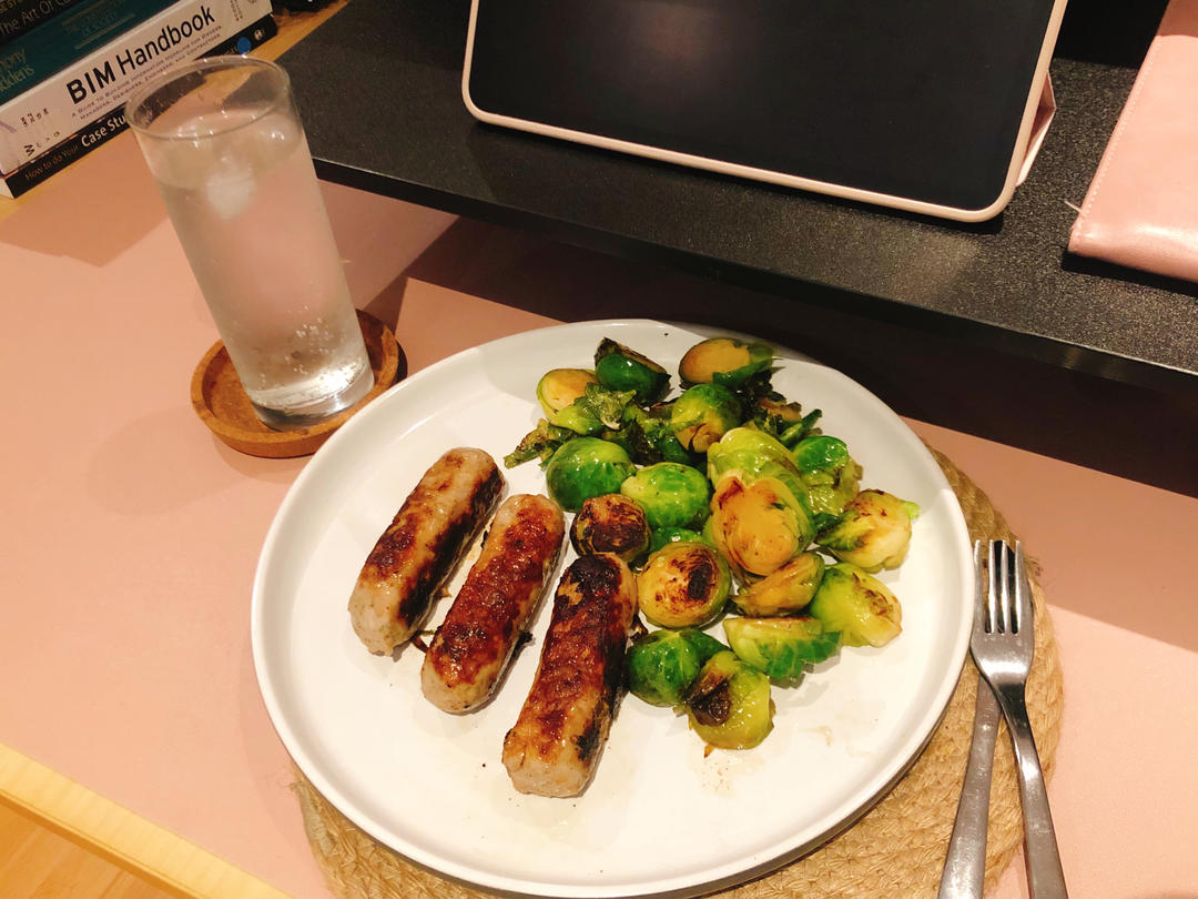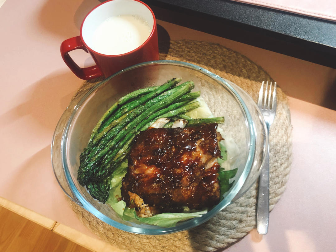 午饭是BBQ烤猪排➕烤芦笋➕生菜➕豆奶,为了避免没忍住吃太多的情况只能做的少一点,所以猪排只烤了三分之一……本想吃个烤猪...