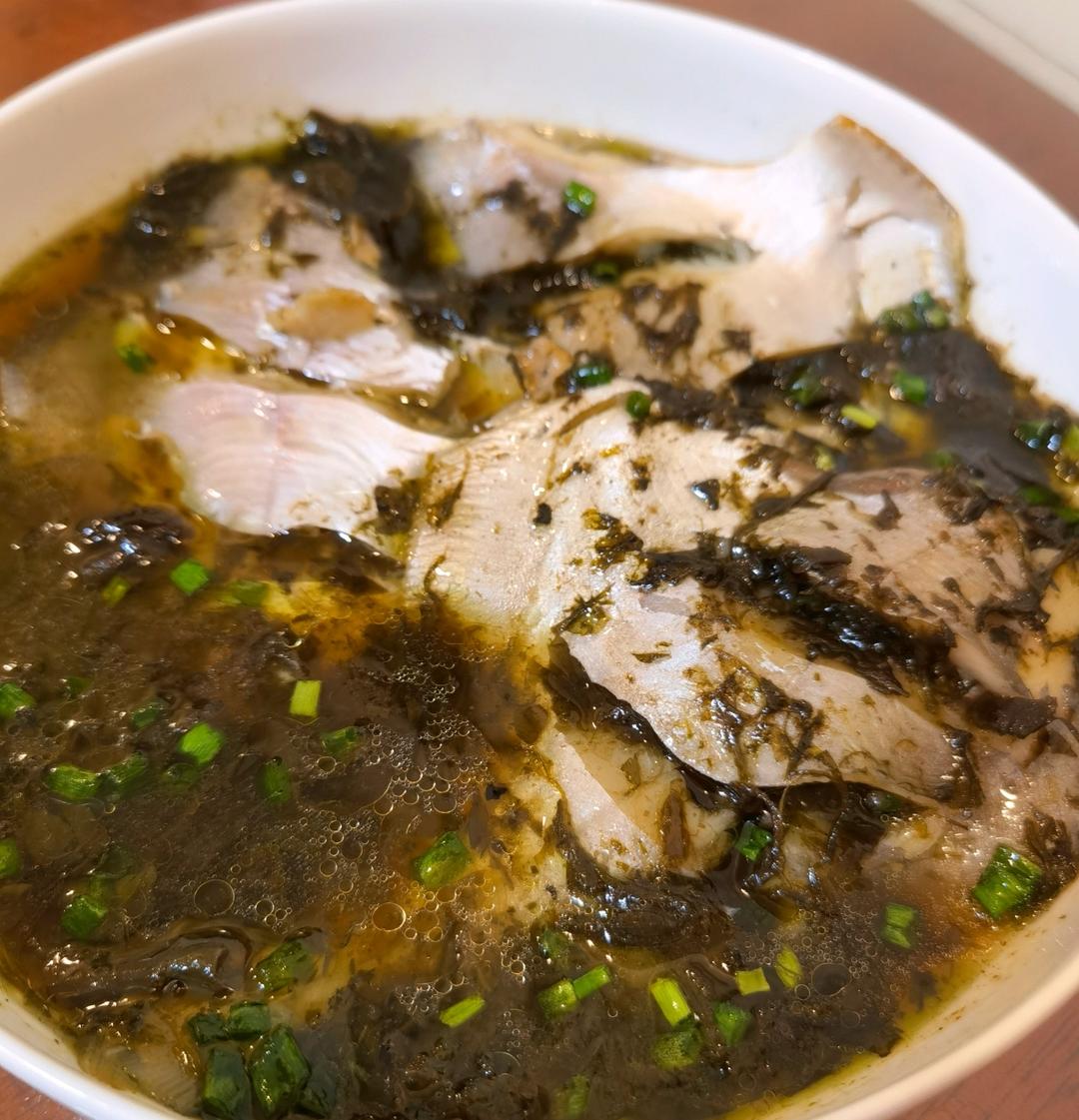 没有用咸菜,选择橄榄菜。小鲳鱼蒸好后+橄榄菜,再蒸一分钟,葱油淋一下。