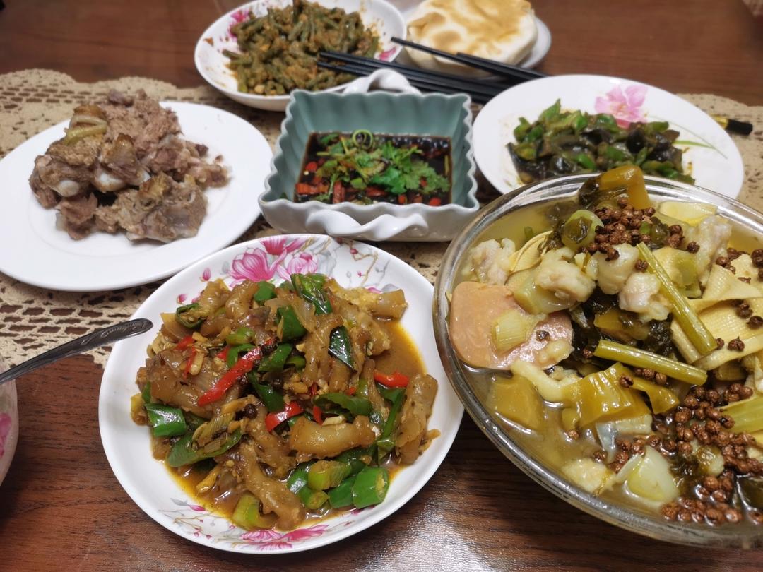 酸菜鱼+炒牛蹄筋+排骨+麻汁豆角+青椒皮蛋