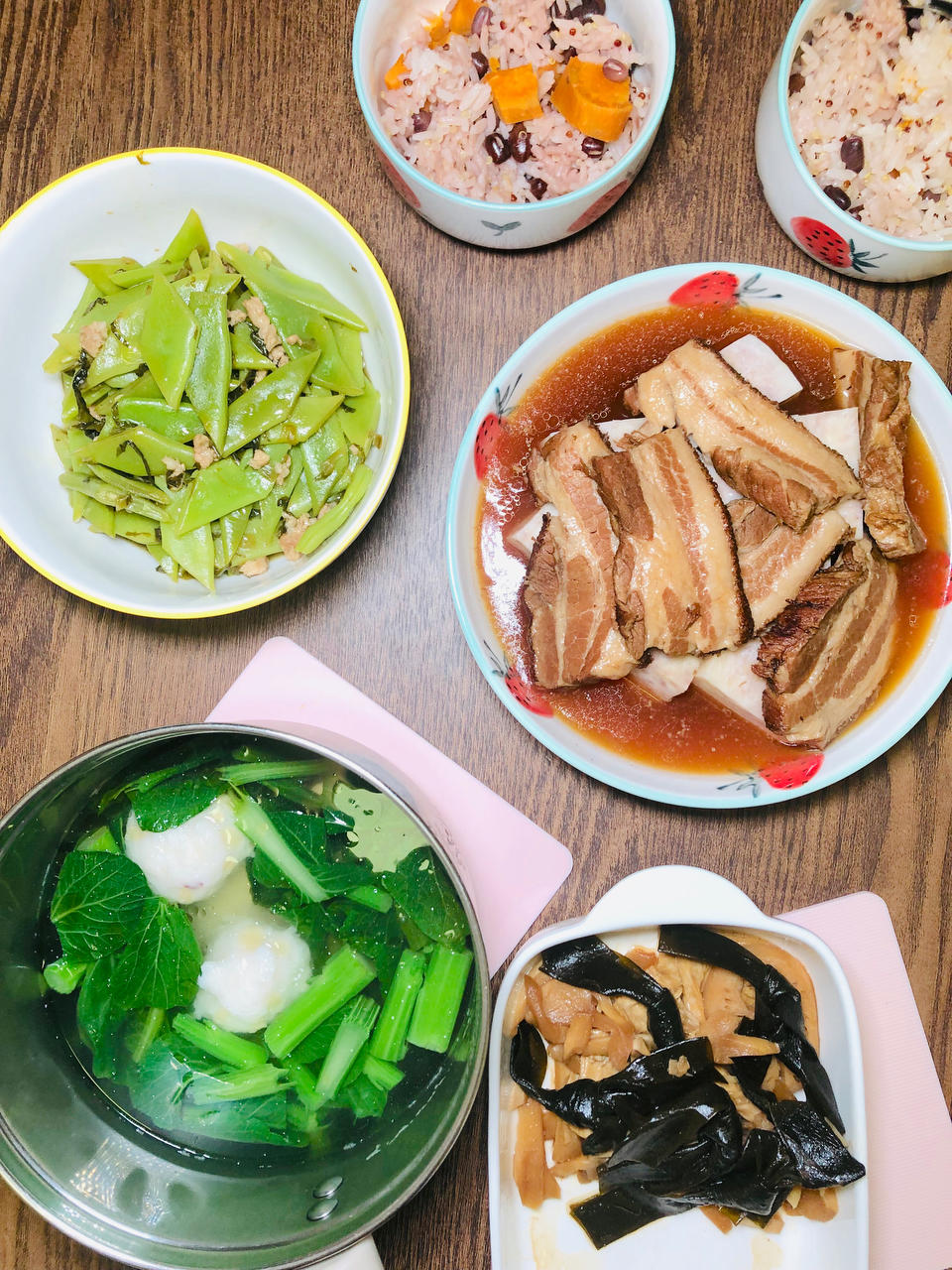 扣肉蒸芋头(古龙扣肉罐头),肉沫雪菜豆角,卤素菜,菜心墨鱼丸汤,红豆地瓜藜麦饭(泡了24小...