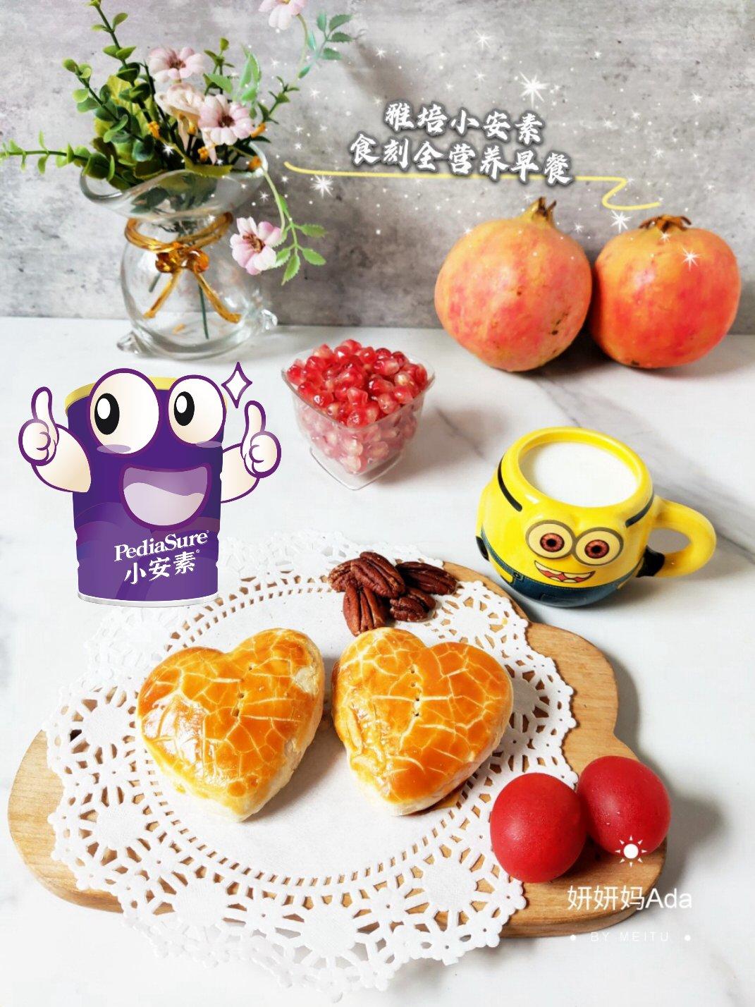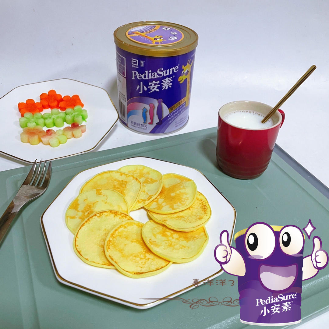 一杯雅培小安素奶粉冲调的牛奶+奶香爱心❤️鲜甜玉米饼+水果