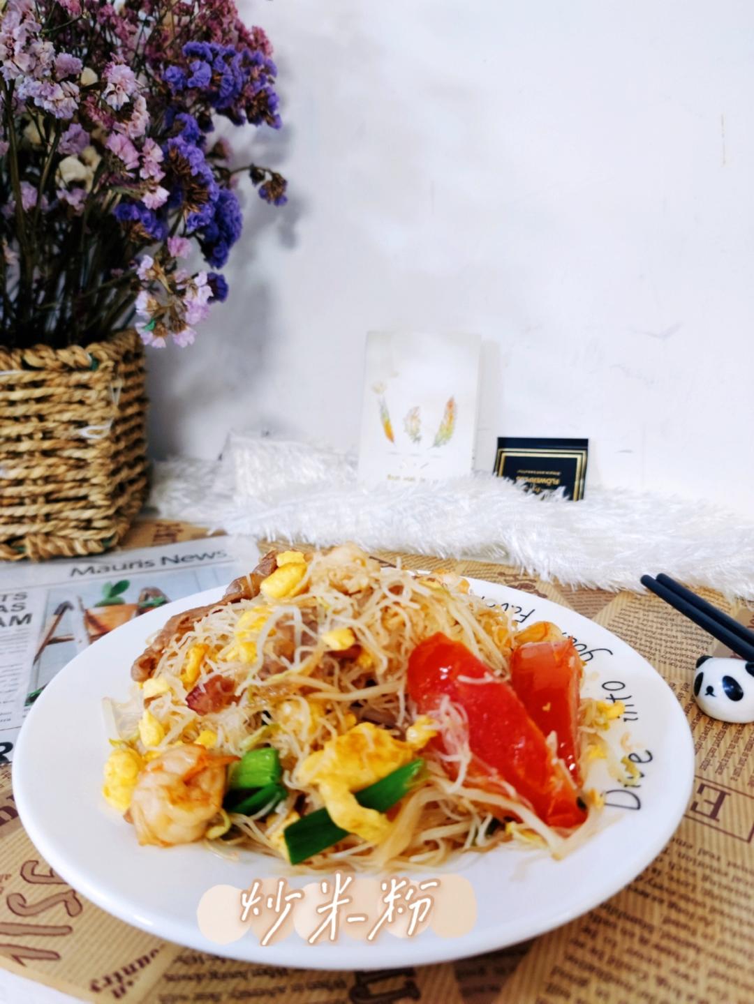 香喷喷的炒米粉,虾,肉,蛋,豆芽,番茄炒出香味扑鼻的米粉。