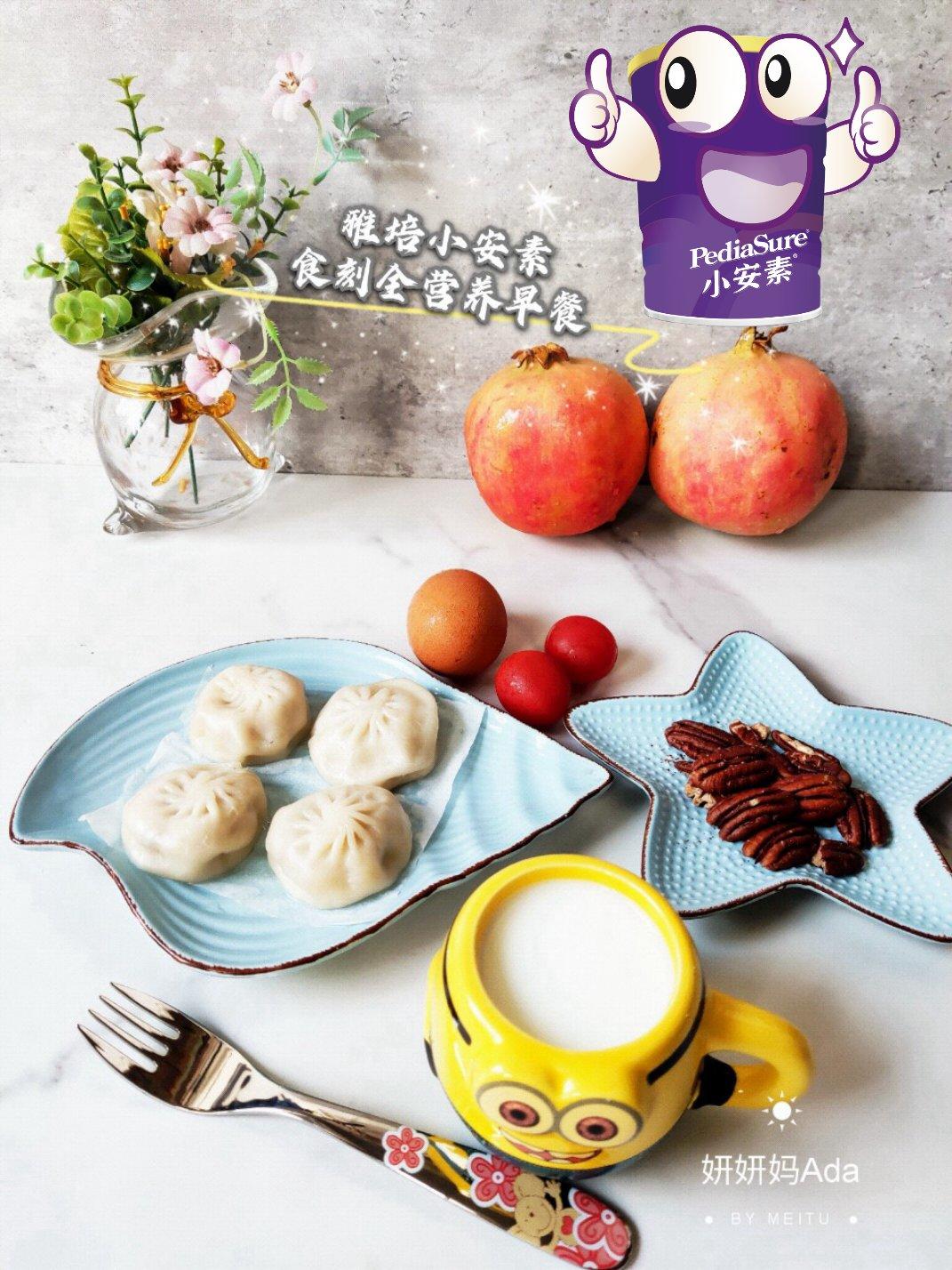 灌汤小笼包+一杯雅培小安素奶粉冲调的牛奶+坚果+鸡蛋+圣女果