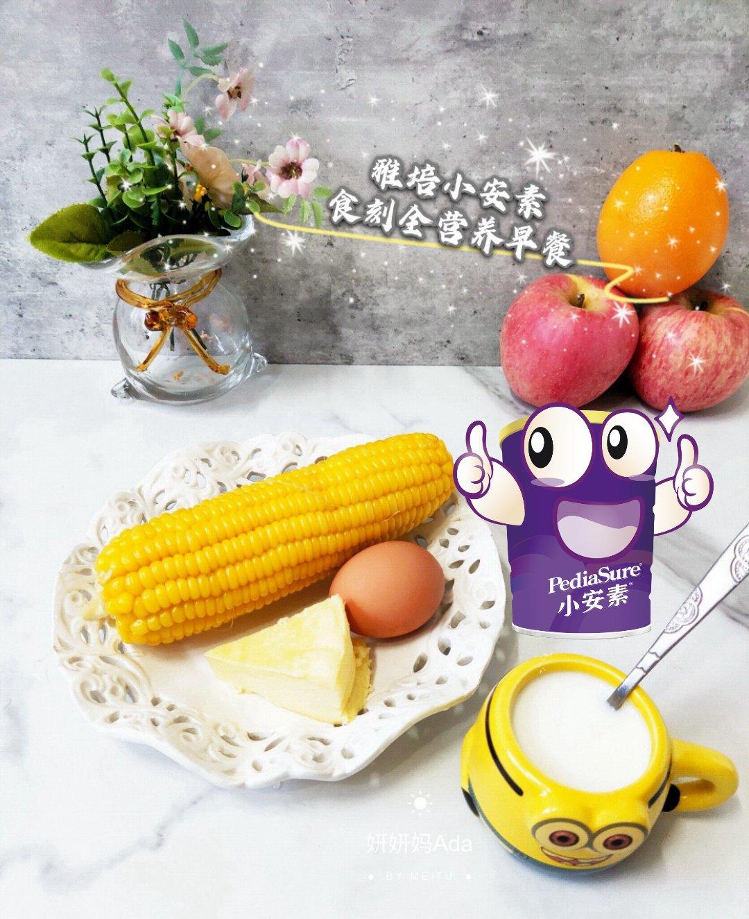 一杯雅培小安素奶粉冲调的牛奶+水煮鸡蛋+椰浆蛋糕+玉米