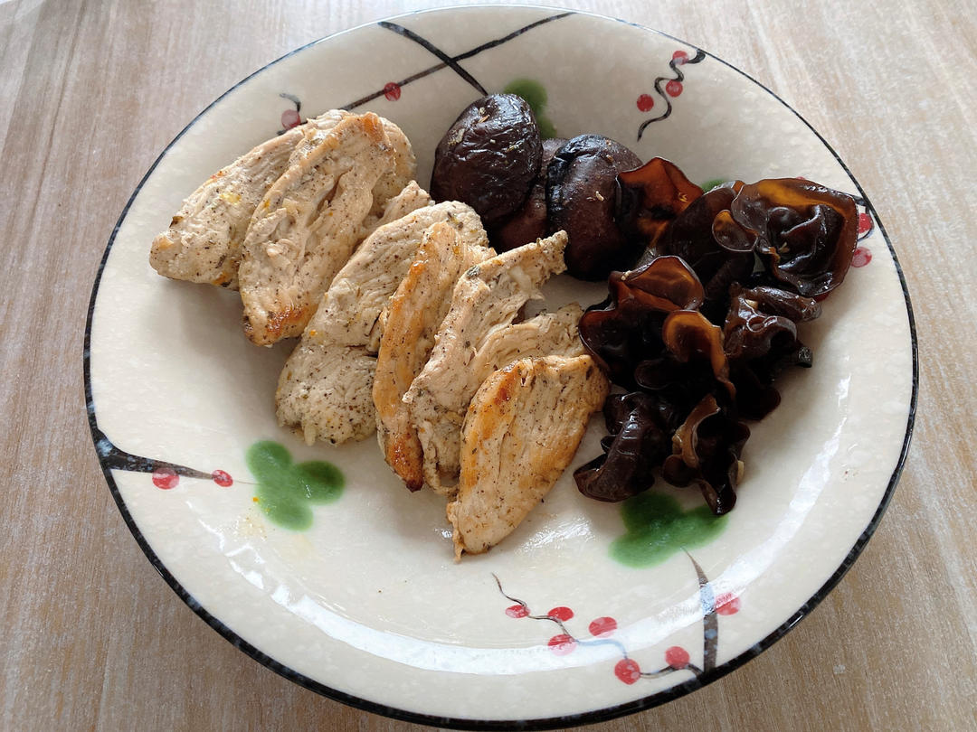有点点咸了,看来鸡肉没有牛排厚实,好入味。香菇和木耳要先焯水煮熟,然后放煎鸡胸的酱汁...