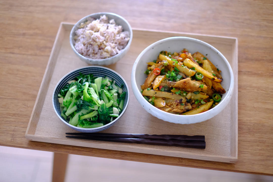 孜然鸡翅土豆条|清炒小白菜|杂粮饭